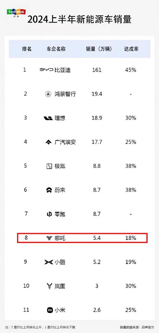 今年上半年,哪吒汽车的累计销量仅为5.4万辆,不及2023年(销量12.42万辆)的一半,2024年年销30万辆的目标也仅达成18%。下半年哪吒汽车的销售任务挺重。