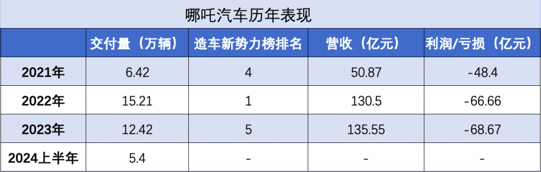 2023年,哪吒汽车交付量为12.7万辆,位列造车新势力第五名,销量掉队。并且也未实现其2023年交付25万辆的预期目标;