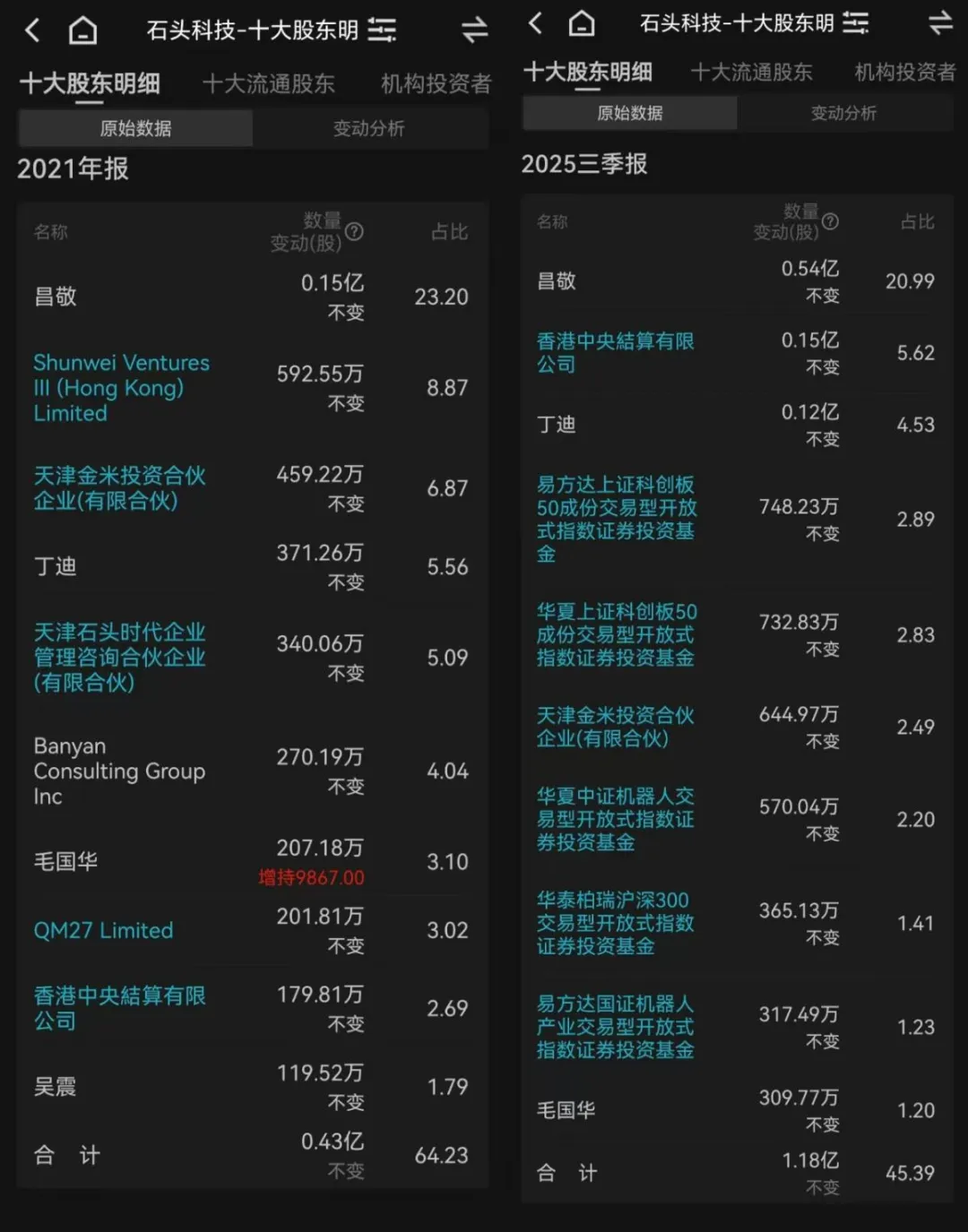 2021年年报显示,Shunwei(顺为)、天津金米、天津石头时代、启明分别持有石头科技8.87%、6.87%、3.02%的股份。而截至2025年三季度,天津金米的持股比例下降到2.49%,顺为、天津石头时代、启明已经退出十大股东行列。