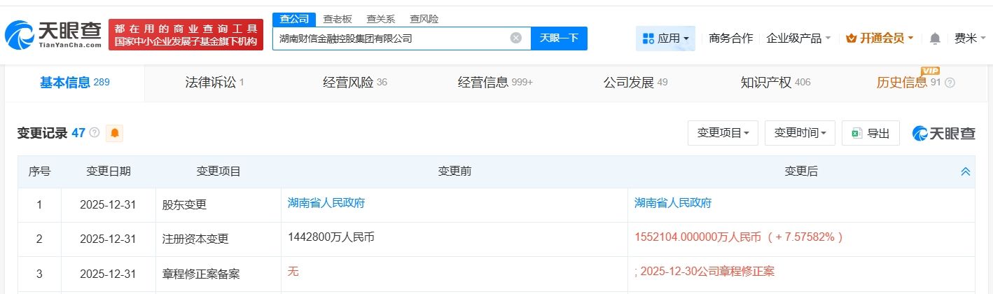天眼查工商信息显示,近日,湖南财信金融控股集团有限公司发生工商变更,注册资本由144.28亿人民币增至约155亿人民币,增幅约8%。