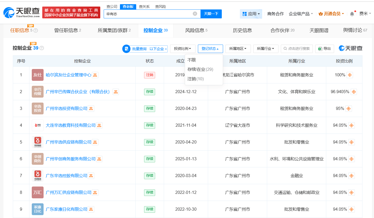 天眼查任职信息显示,辛有志(辛巴)名下关联5家企业,其中3家处于存续或者开业状态,分别是广州辛选投资有限公司、广西新迅达科技集团股份公司、广州辛巴传媒合伙企业(有限合伙),其余2家企业已注销。
