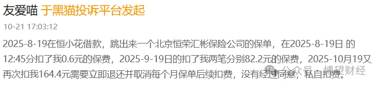 有用户反映,借款首月被扣0.6元,次月即被扣82.2元,甚至连续叠加扣费,第三个月扣费高达 164.4 元且持续不停。按此计算,全年保险费用高达 1809 元,竟是首月保费的3015 倍。大量用户发现异常扣费后申请退保,却遭遇平台层层推诿、拒不处理,合法维权之路寸步难行。