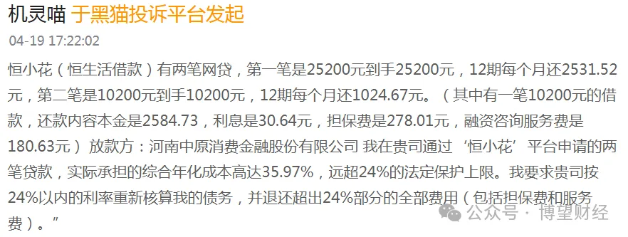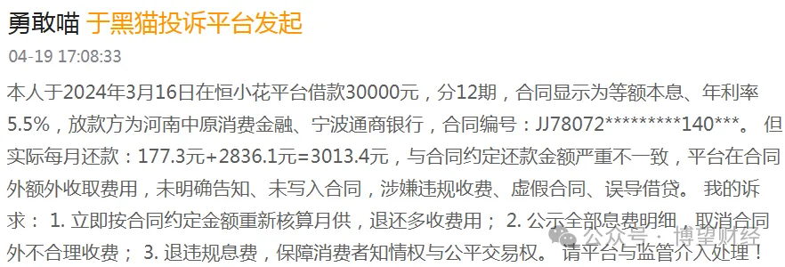 一面是汹涌的负面舆情:截至2026年4月20日,黑猫投诉平台上关于“恒昌公司”的投诉多达103345条,其中利率超标问题是重灾区,主要表现为双融担、隐藏收费、变相砍头息等。