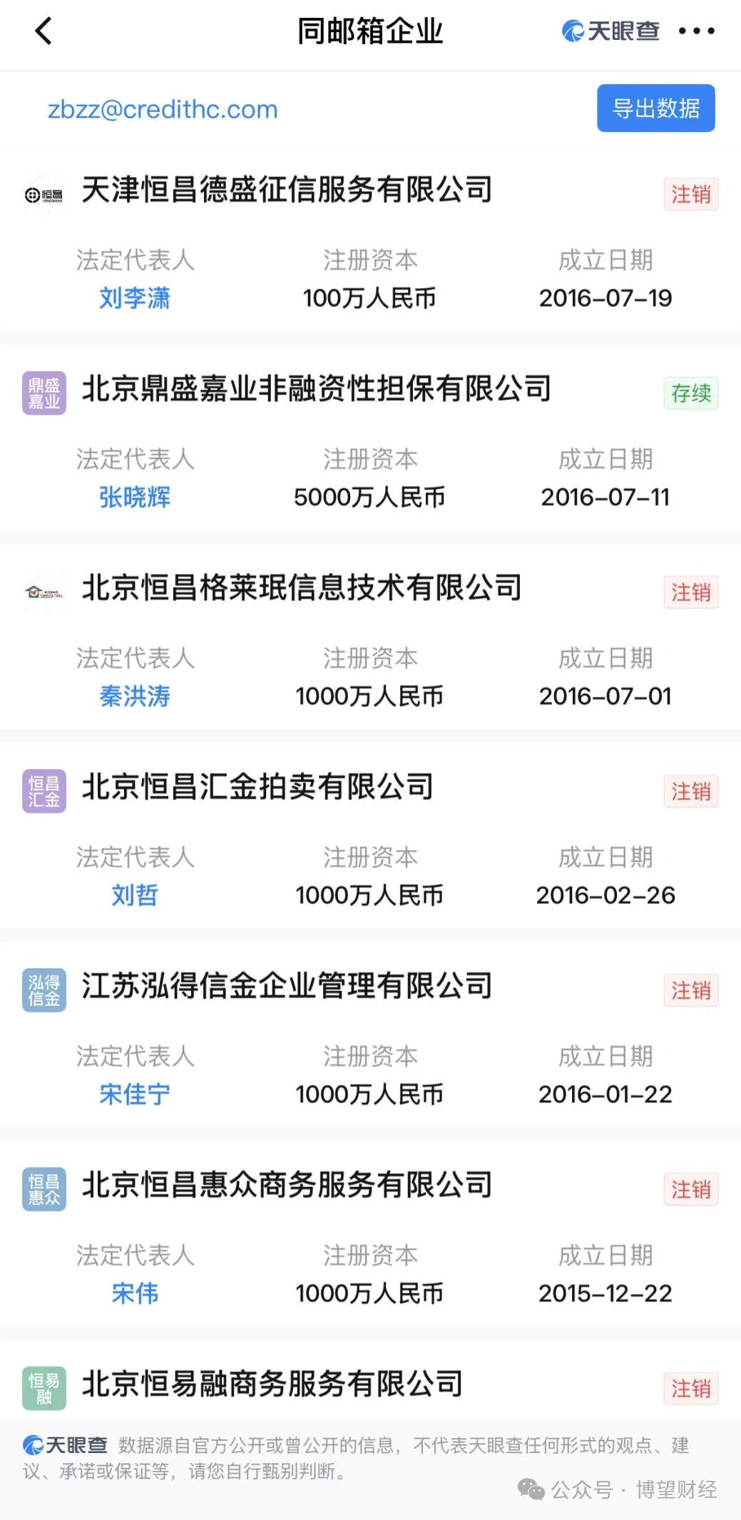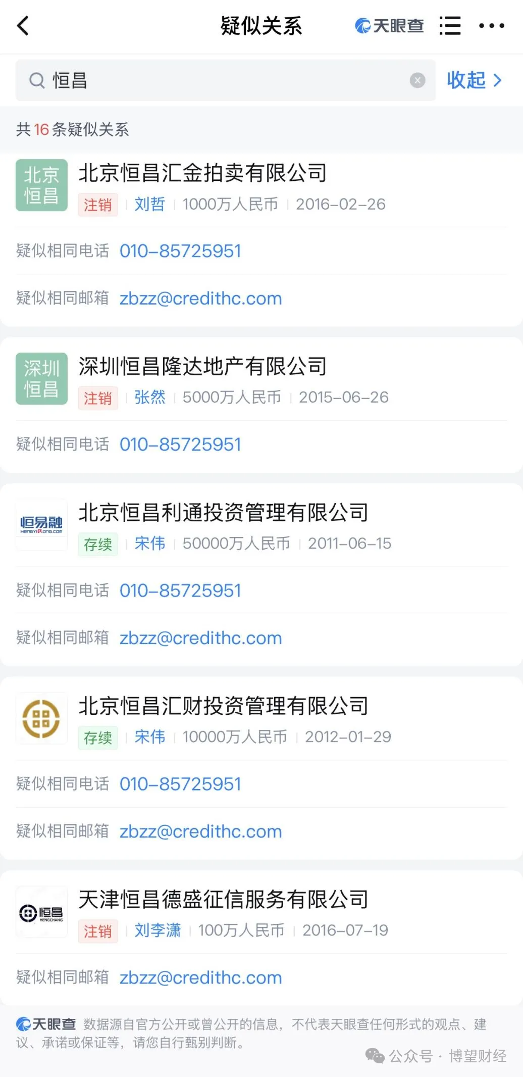 天眼查数据显示,普融花运营主体由恒昌投资(香港)国际全资控股;恒小花运营主体乐享无限曾由恒昌实控人秦洪涛间接控股。历经两次股权变更后,仍与多家恒昌系企业共用联系邮箱,其中包括由秦洪涛直接担任法人的北京恒昌格莱珉信息技术有限公司(现已注销),关联关系铁证如山。