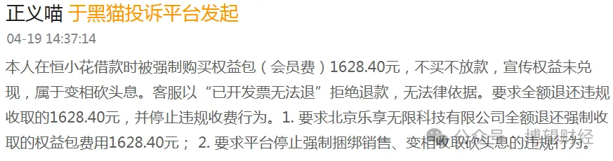 此外,强制捆绑销售已成常态。另有用户称,在恒小花借款时被强制购买权益包(会员费)1628.40元,不买不放款。而购买后平台并未兑现其宣称的会员权益,并以“已开发票无法退”为由拒绝退款。