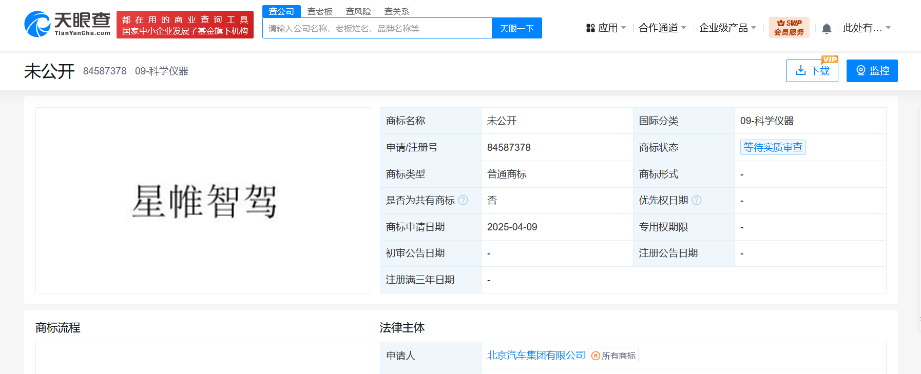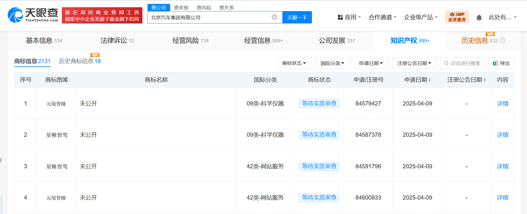 天眼查财产线索信息显示,近日,北京汽车集团有限公司申请注册两枚“星帷智驾”“元境智瞳”商标,国际分类为网站服务、科学仪器,当前商标状态均为等待实质审查。