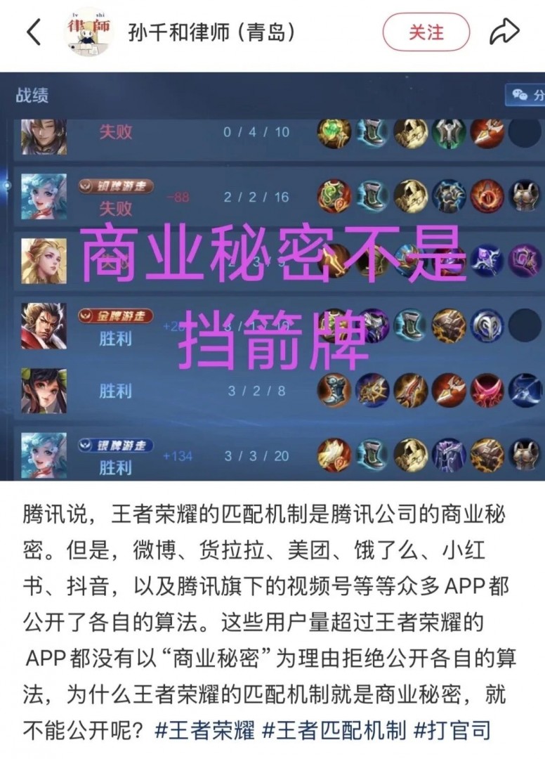 因为一名律师,应该知道消费者保护法里的知情权不包括算法,也就是说这场官司从根本上缺乏法律依据支持。而且想要证明王者荣耀的匹配机制不公平,很难找到切实的证据,这点孙律师自己也不否认,对媒体直言找证据很难。换句话说,在没有请求权基础且缺乏证据的情况下,她还是选择打一场没有胜算的诉讼。