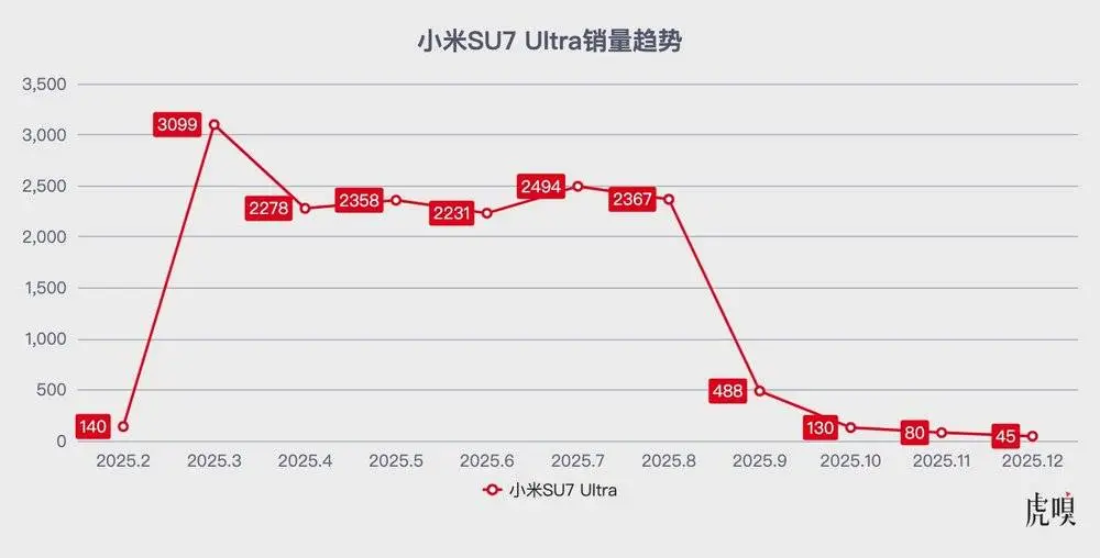 从2025年9月起,小米SU7 Ultra月销量暴跌,直至去年12月份,从最高峰月销三千多辆,下滑到月销只有45辆。