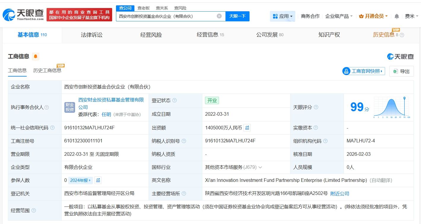 天眼查App显示,近日,西安市创新投资基金合伙企业(有限合伙)发生工商变更,出资额由100.5亿人民币增至140.5亿人民币,增幅约40%。