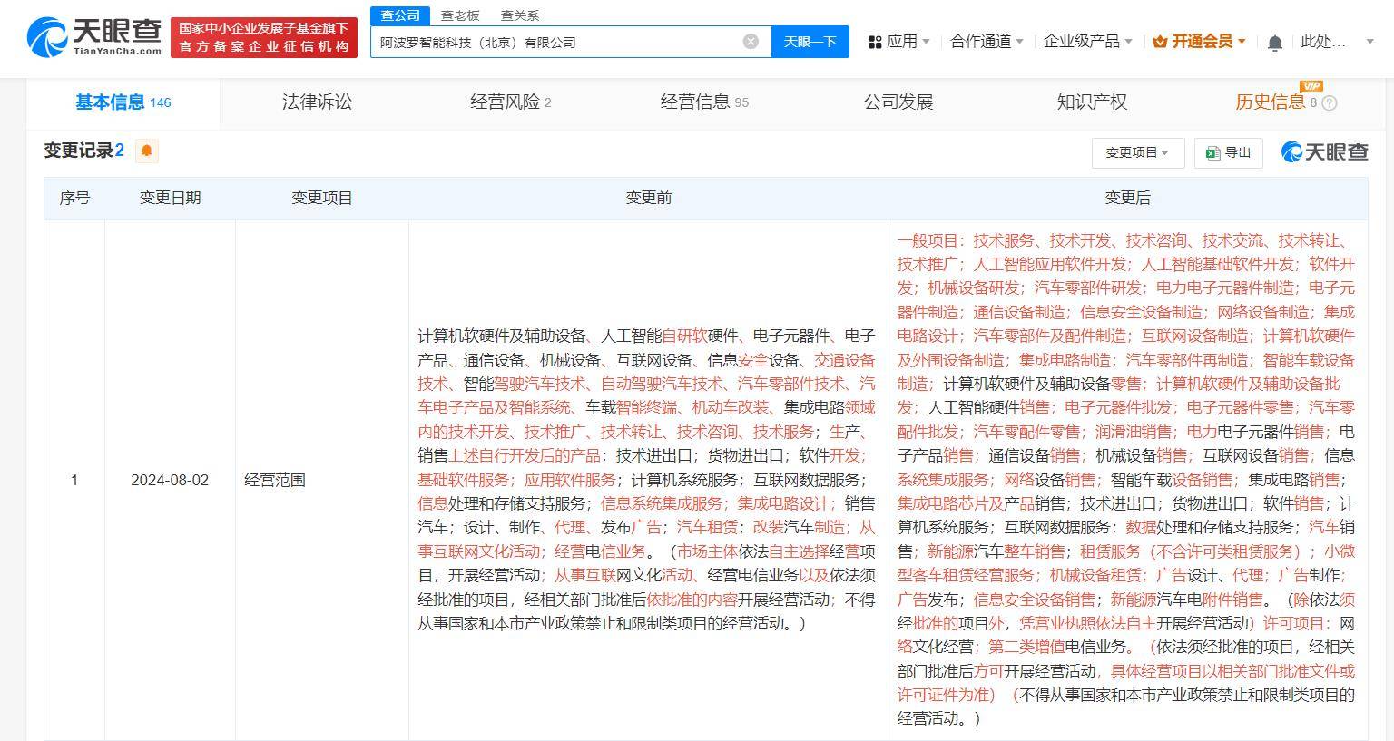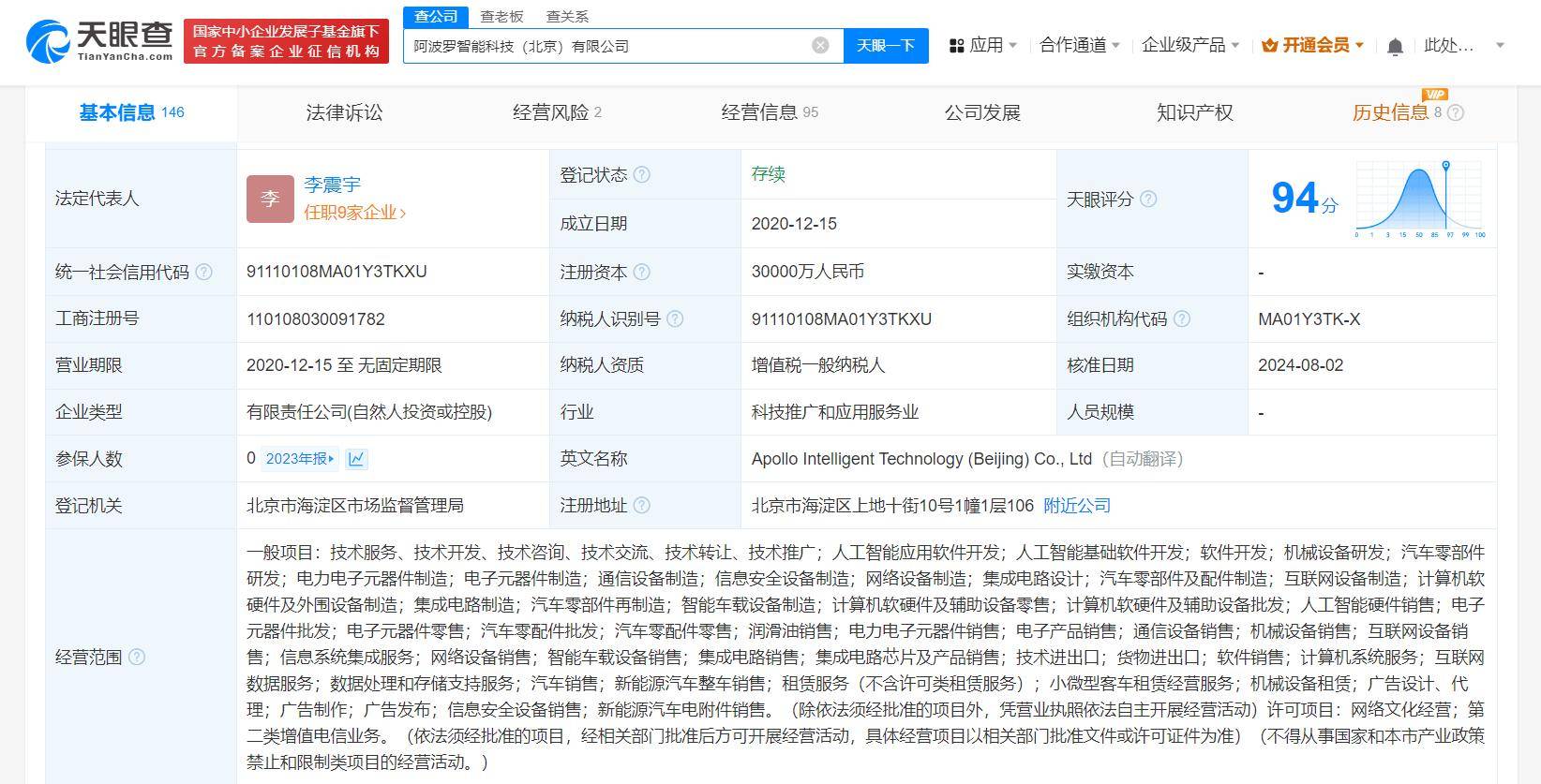 天眼查App显示,近日,阿波罗智能科技有限公司发生工商变更,经营范围新增汽车零部件研发、汽车零配件零售、润滑油销售、新能源汽车整车销售、小微型客车租赁经营服务、新能源汽车电附件销售等。