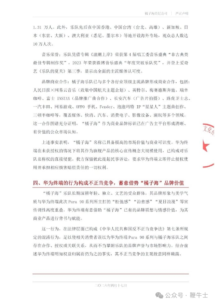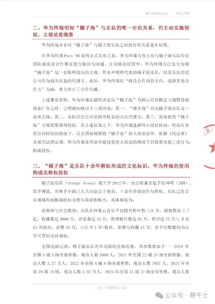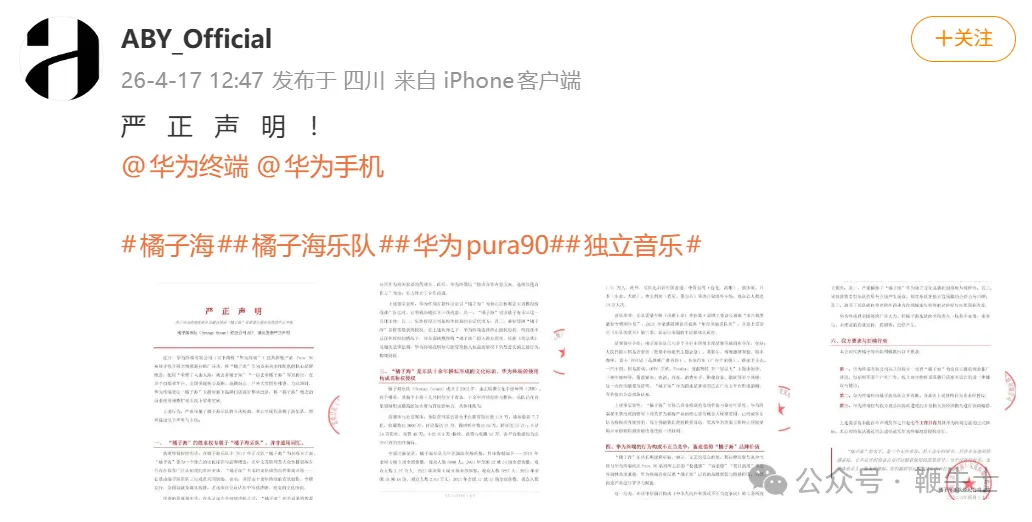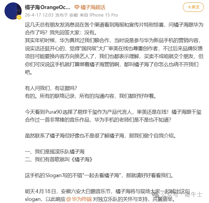 4月17日,独立摇滚乐队橘子海通过官方微博及经纪公司发布严正声明,直指华为终端在Pura 90系列手机营销中,未经授权大规模使用 “橘子海” 概念进行商业推广。