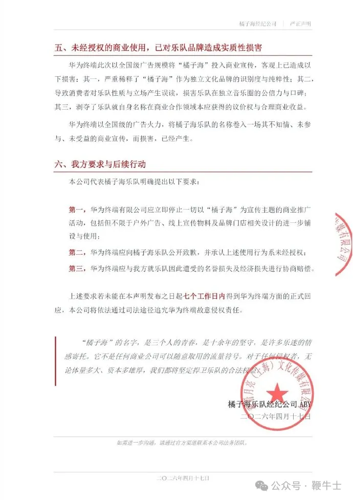 橘子海乐队指责华为侵权!要求七日内致歉并赔偿观点