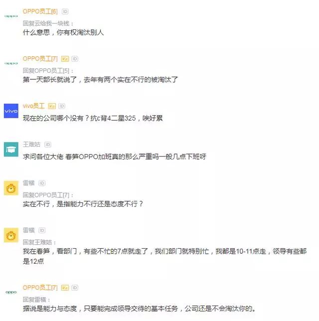 有网友就说到。oppo的10点确实该焦虑,领导会认为你工作不饱和。问了旁边的人每个组都有一个被淘汰的。绩效B的组一般都要消化一两个D指标,不是看能力的,一般是给不听话的。所在的组绩效一般一般都要消化一两个,不是严格的5%。