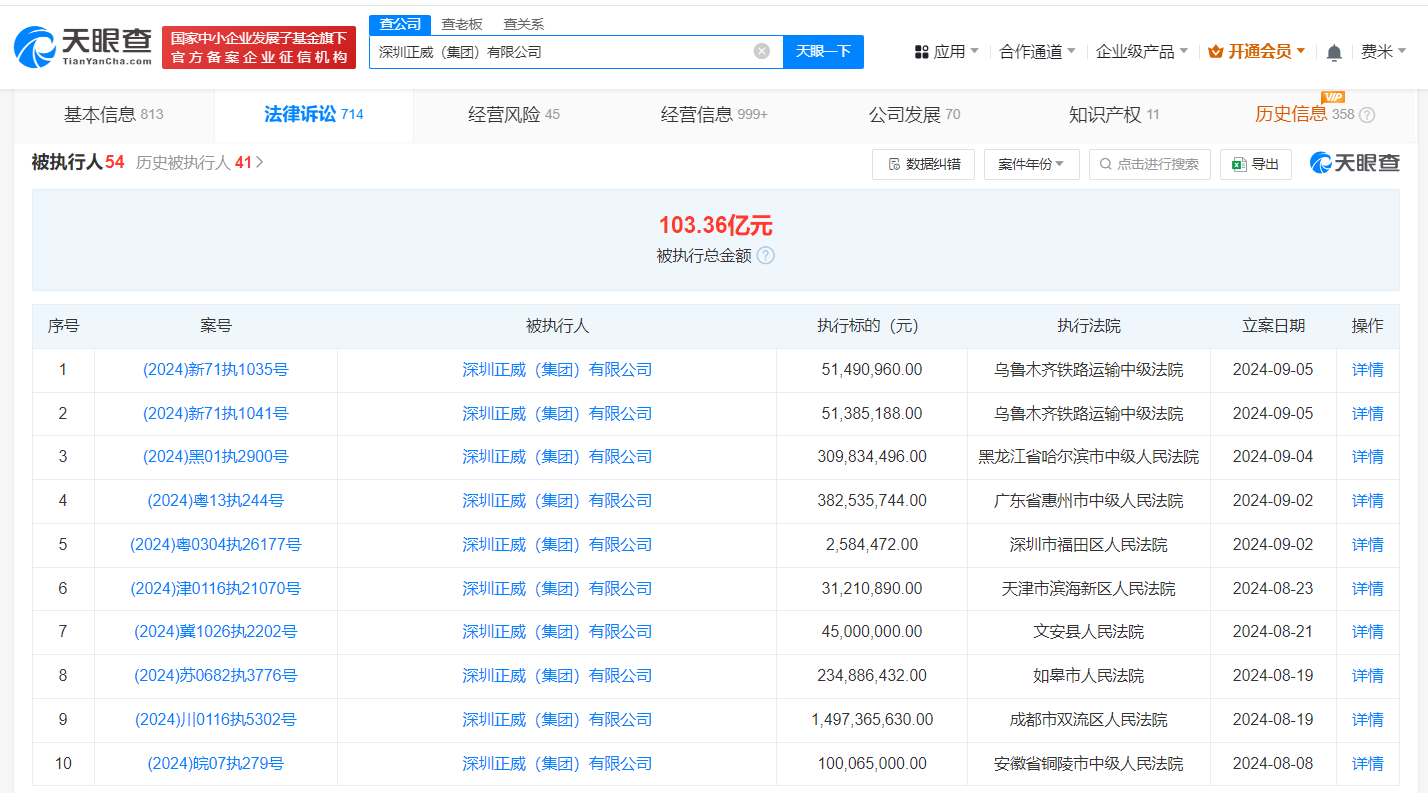 风险信息显示,深圳正威(集团)有限公司现存54条被执行人信息,被执行总金额超103亿元。此外,该公司还存在多个限制消费令、失信被执行人(老赖)及终本案件信息。