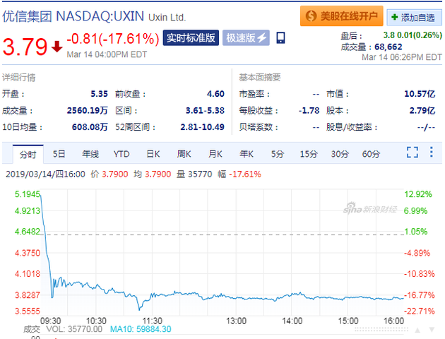 新浪科技讯 北京时间3月15日消息,优信股价周四剧烈震荡,开盘大涨16%后转跌,截止收盘,优信股价大跌17.61%报3.79美元。