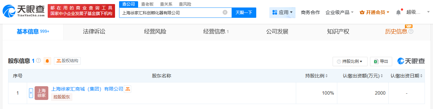 天眼查App显示,上海徐家汇科创孵化器有限公司成立,法定代表人为傅斌梁,注册资本2000万人民币,经营范围包括创业空间服务、数据处理和存储支持服务、社会经济咨询服务等。股东信息显示,该公司由上海徐家汇商城(集团)有限公司全资持股。