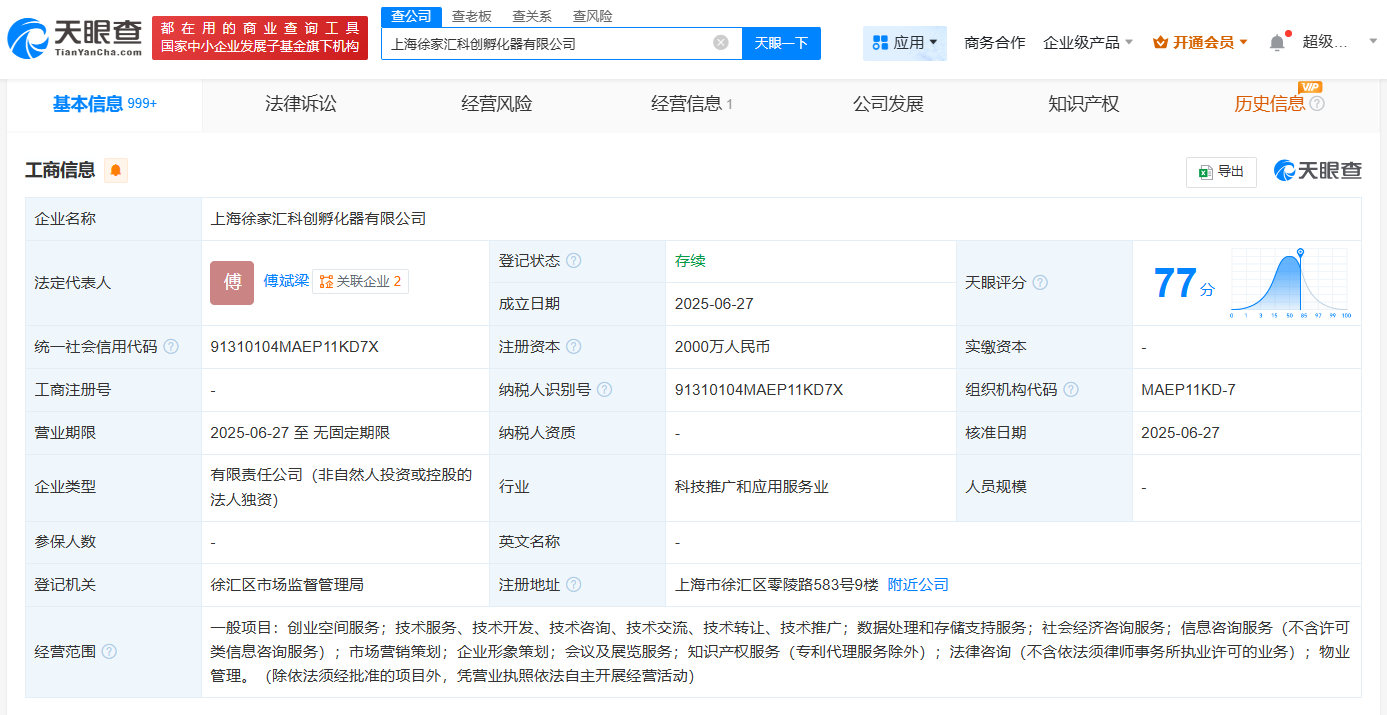 天眼查App显示,上海徐家汇科创孵化器有限公司成立,法定代表人为傅斌梁,注册资本2000万人民币,经营范围包括创业空间服务、数据处理和存储支持服务、社会经济咨询服务等。