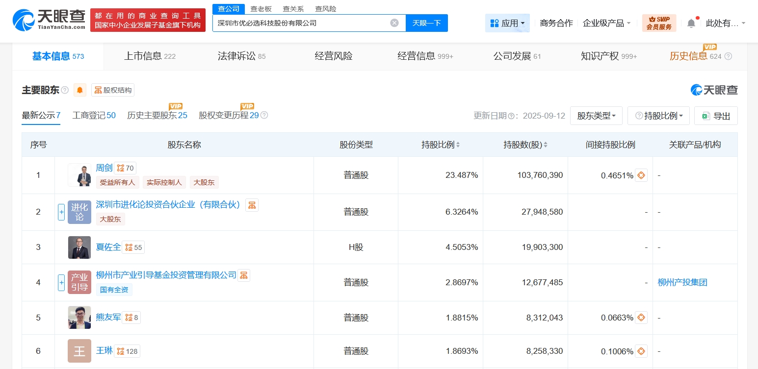 深圳市优必选科技股份有限公司成立于2012年3月,法定代表人为周剑,经营范围含从事智能机器人、人工智能算法、软件、通讯设备、玩具及相关领域的技术研发、技术咨询,智能机器人、人工智能算法、软件、通讯设备、玩具的销售、批发、进出口及相关配套业务等。股东信息显示,该公司由周剑、深圳市进化论投资合伙企业(有限合伙)、夏佐全等共同持股。