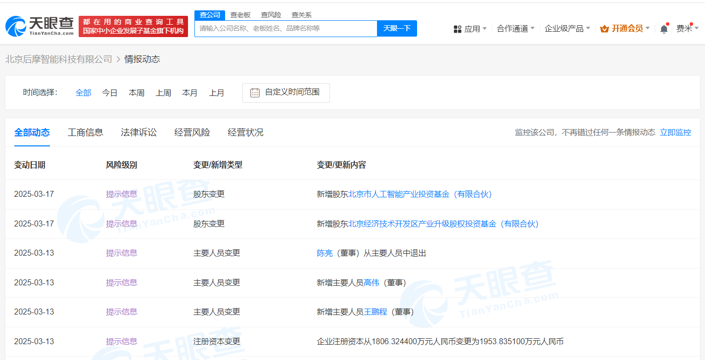 天眼查App显示,近日,北京后摩智能科技有限公司发生工商变更,新增北京市人工智能产业投资基金(有限合伙)、北京经济技术开发区产业升级股权投资基金(有限合伙)为股东,注册资本由约1806万人民币增至约1954万人民币,同时多位高管发生变更。