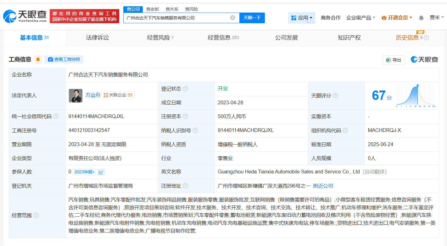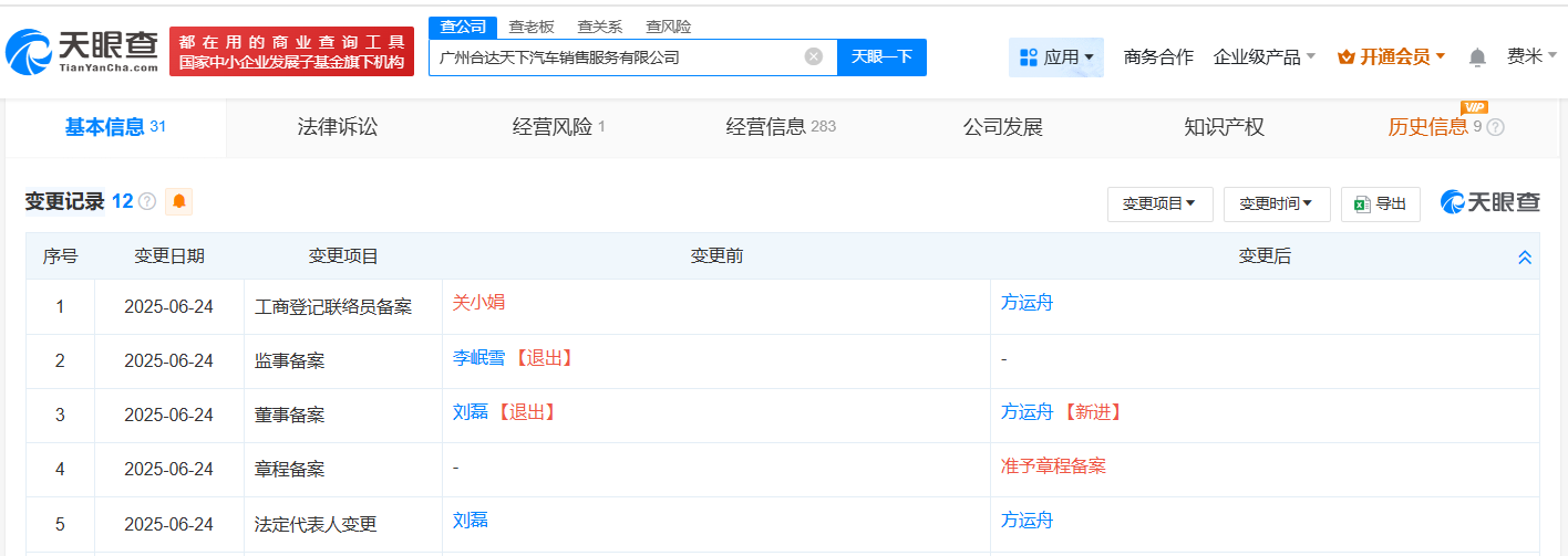 天眼查App显示,近日,广州合达天下汽车销售服务有限公司发生工商变更,刘磊卸任法定代表人、董事、经理,由方运舟接任。