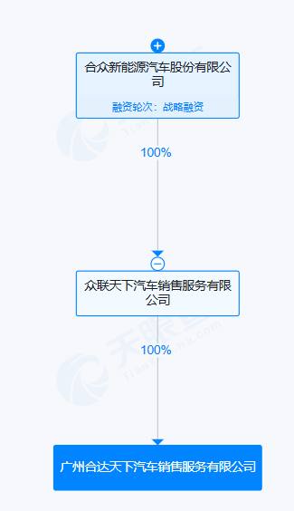 该公司成立于2023年4月,注册资本500万人民币,经营范围包括汽车销售、玩具销售、汽车零配件批发等。股权全景穿透图显示,该公司由哪吒汽车关联公司合众新能源汽车股份有限公司子公司众联天下汽车销售服务有限公司全资持股。