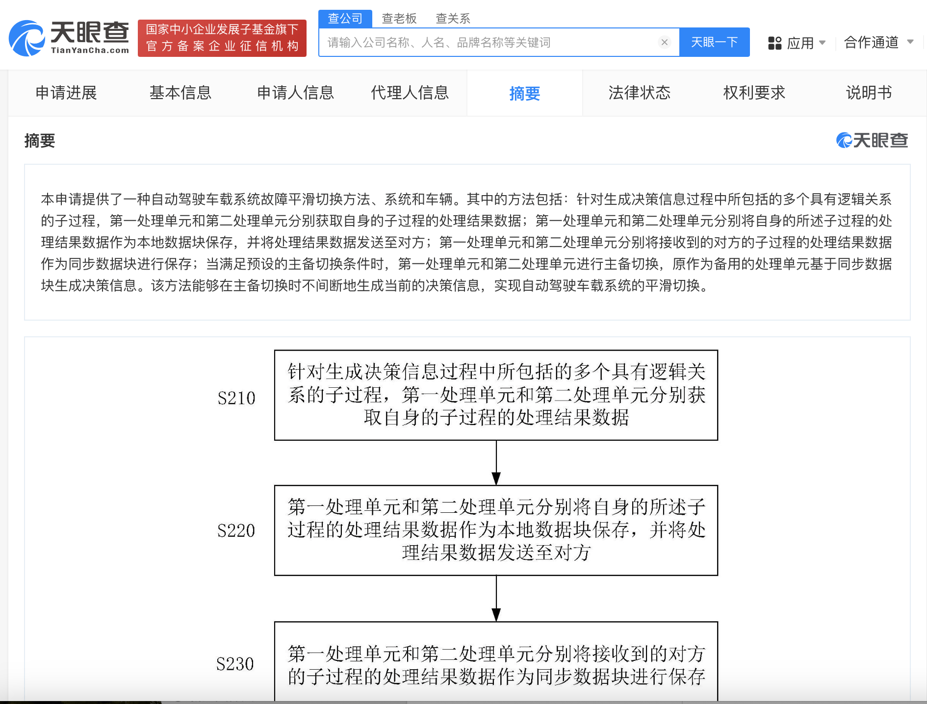 天眼查知识产权信息显示,近日,比亚迪股份有限公司申请的“自动驾驶车载系统故障平滑切换方法、系统和车辆”专利公布。
