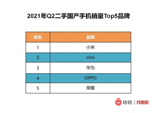 数据显示,今年二季度小米手机超越vivo成为二手市场交易量最高的国产手机品牌,vivo、华为、OPPO和荣耀则分列二到五位。