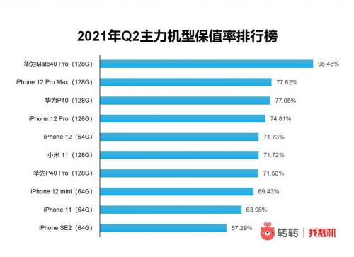 其中保值率最高的iPhone 12 Pro Max(128G)从Q1的84.40%下滑到了77.62%,而iPhone 12 Pro(128G)的保值率更是从85.59%跌至74.81%,价值缩水十分之一;相比之下华为手机的保值率有所上涨,其中华为Mate40 Pro (128G)的保值率最高,达到了96.45%。