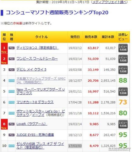 日媒4Gamer发布了新一期一周游戏销量榜(3月11日至3月17日),《全境封锁2》以6.3万的销量登上榜首,《海贼王:寻秘世界》位列第二。