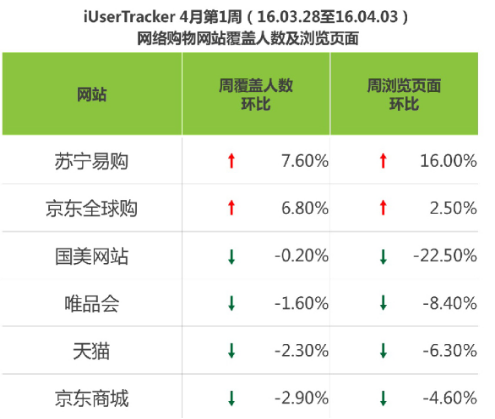 有诚意的折扣,成为引流利器。艾瑞咨询同时观察发现,4月首周(3月28日至4月3日) 苏宁易购流量抢先上升,周覆盖人数环比上涨7.6个百分点,周浏览页面环比上涨16个百分点。在各大电商网站流量纷纷下降的大背景下,苏宁易购变身万绿丛中一点红,成为进入4月以来流量环比增长幅度最明显的电商企业。