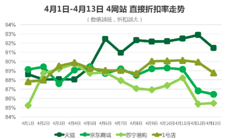 综合分析结果显示,4月1日至13日,苏宁易购直接折扣为87.8%,其他折扣为86.0%。京东直接折扣为88.8%,其他折扣为86.2%。数值越低,意味着折扣越大。