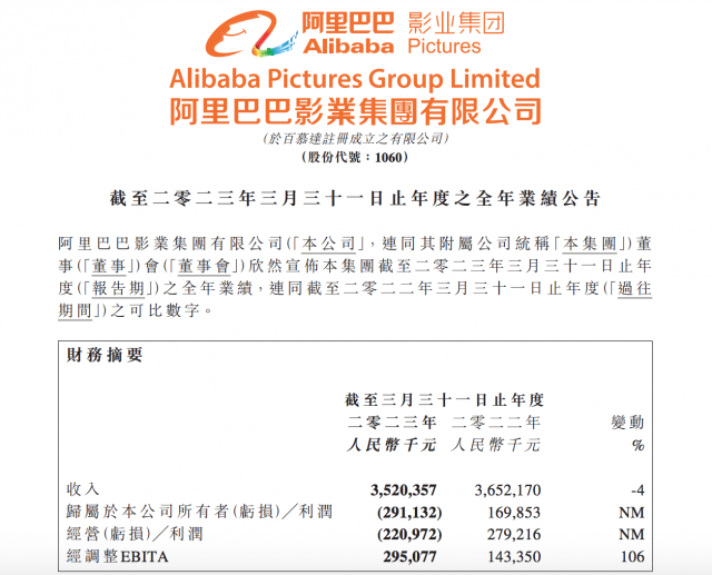 阿里影业2023财年经调整EBITA盈利2.95亿元 同比增加106%快讯