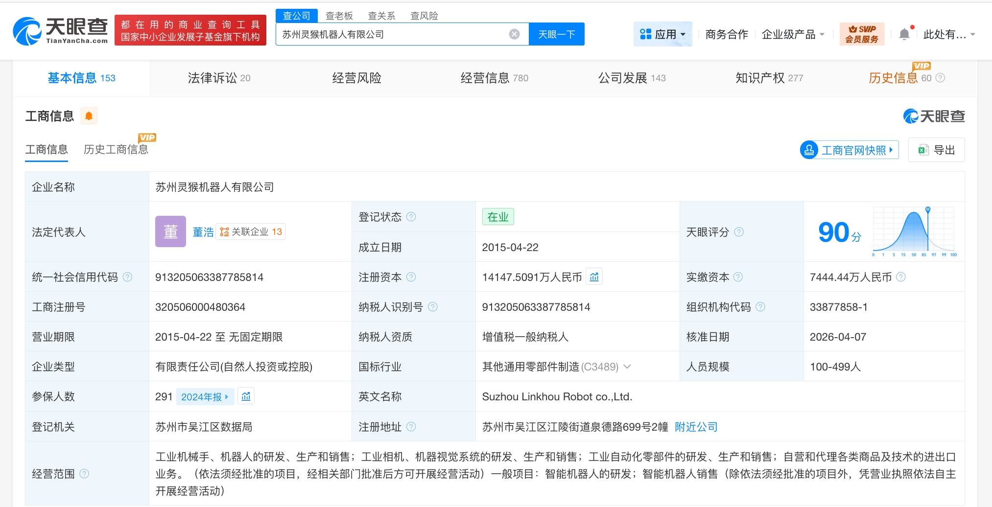 苏州灵猴机器人有限公司成立于2015年4月,法定代表人为董浩,经营范围包括工业机械手、机器人的研发、生产和销售,工业相机、机器视觉系统的研发、生产和销售,智能机器人的研发等,由董浩、博众精工(688097)及上述新增股东等共同持股。