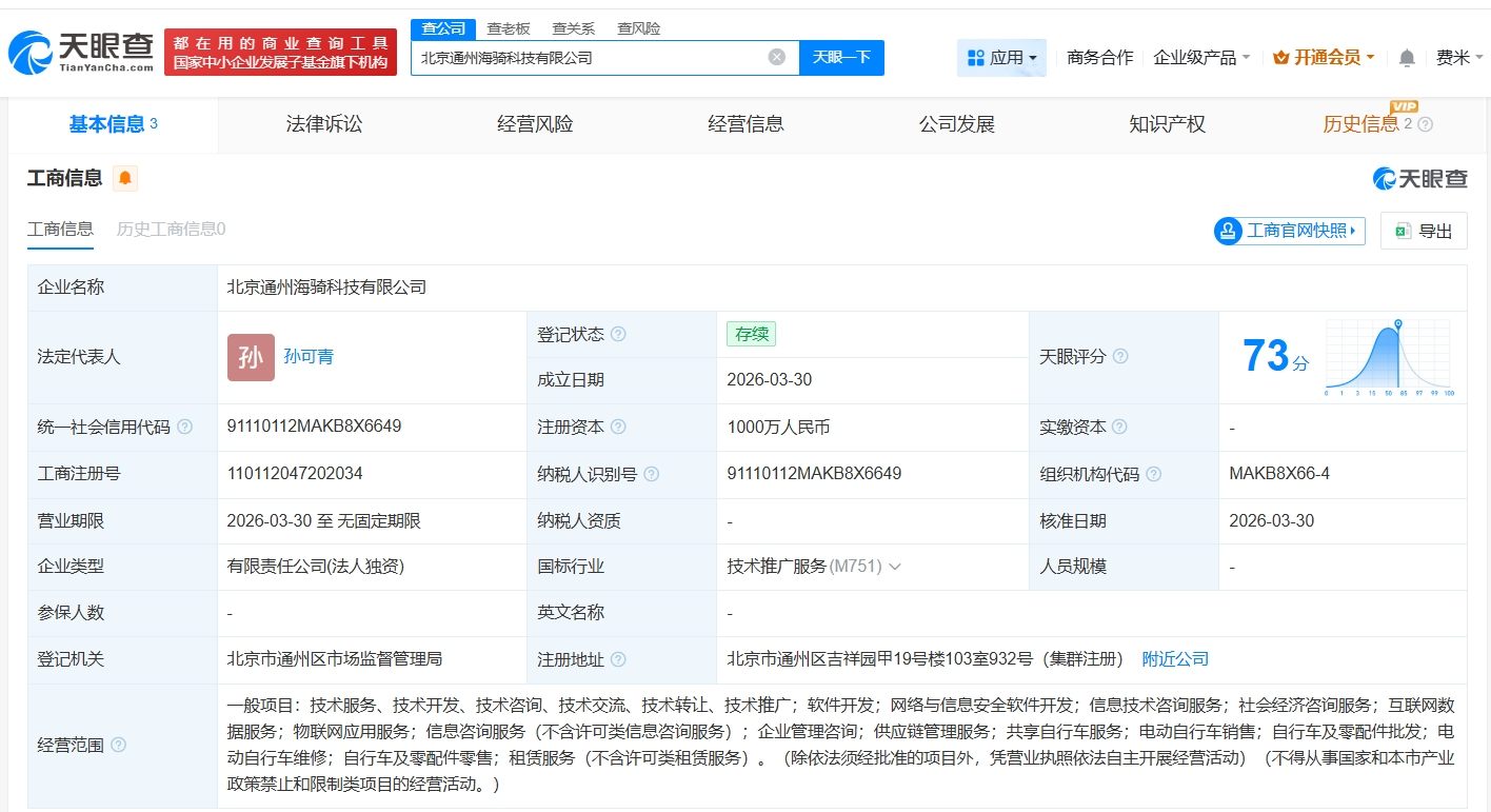 天眼查App显示,近日,北京通州海骑科技有限公司成立,法定代表人为孙可青,注册资本1000万人民币,经营范围含共享自行车服务、电动自行车销售、自行车及零配件批发、物联网应用服务等,由摩拜(北京)信息技术有限公司全资持股。