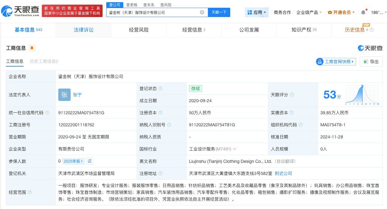 天眼查App显示,王鸥自创服装品牌关联公司鎏金树(天津)服饰设计有限公司成立于2020年9月,法定代表人为张宁,注册资本50万人民币,经营范围包括服饰研发、专业设计服务、服装服饰零售等。股东信息显示,该公司由上海王鸥影视文化工作室、张宁、吴翠英共同持股。变更记录显示,2024年11月,上海王鸥影视文化工作室新增为该公司股东并以60%的持股比例成为控股股东。值得注意的是,2025年年报显示,该公司参保人数为0人。
