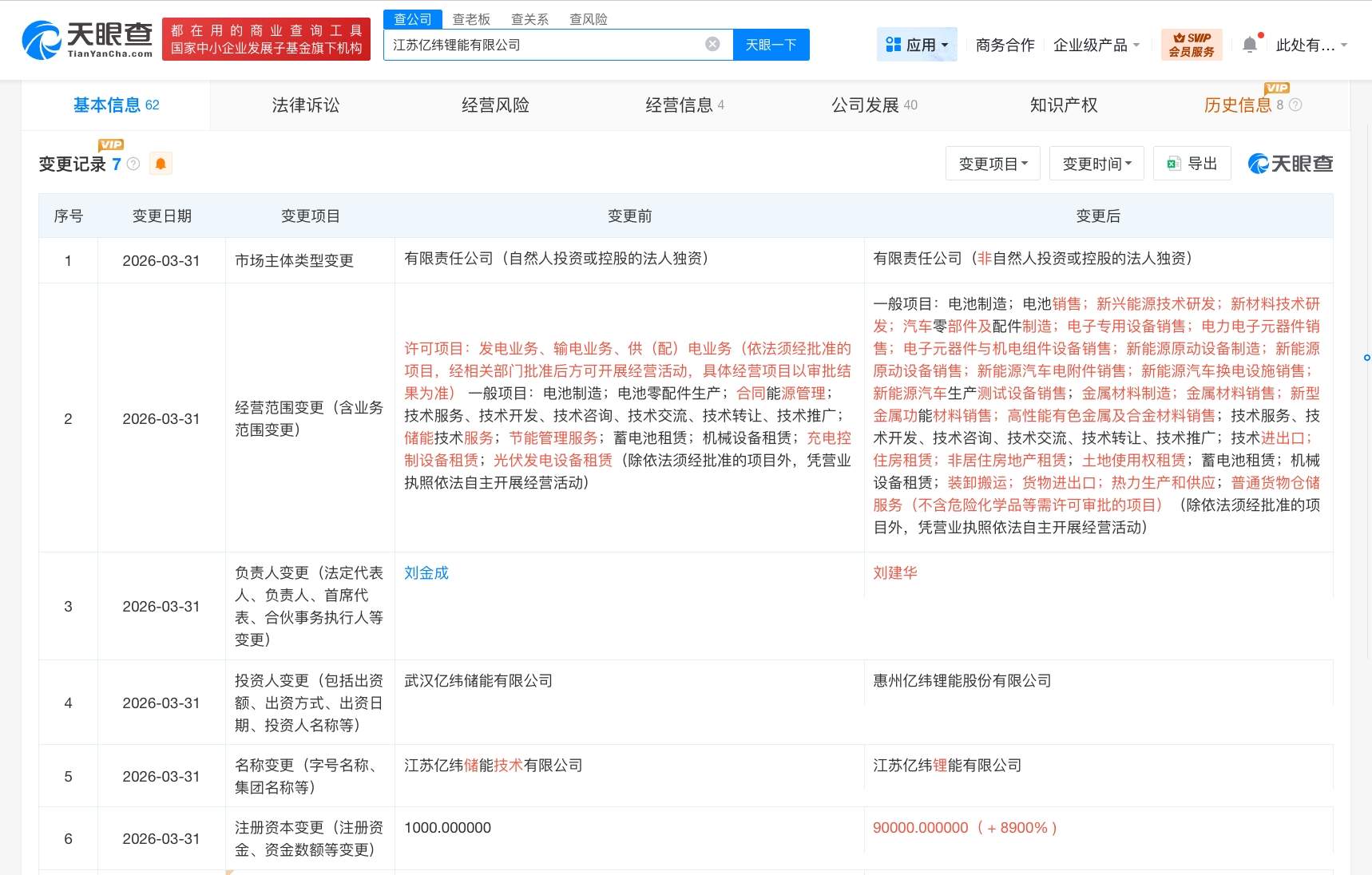 天眼查App显示,近日,江苏亿纬储能技术有限公司发生工商变更,企业名称变更为江苏亿纬锂能有限公司,注册资本由1000万人民币增至9亿人民币,增幅8900%。同时,原股东武汉亿纬储能有限公司退出,新增惠州亿纬锂能股份有限公司为股东并全资持股,刘金成卸任法定代表人,由刘建华接任。