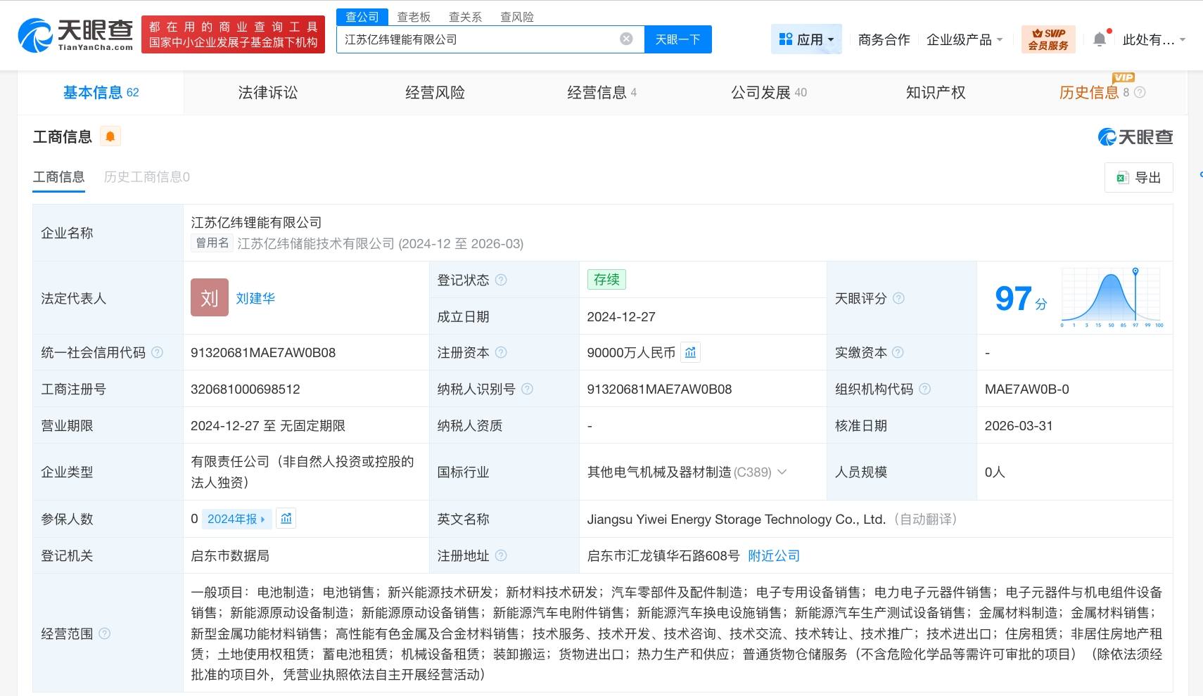 江苏亿纬锂能有限公司成立于2024年12月,经营范围包括电池制造、电池销售、新兴能源技术研发、新材料技术研发、汽车零部件及配件制造、新能源原动设备制造等。