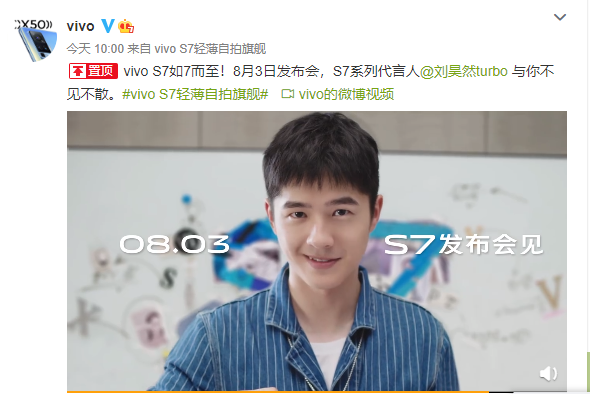 【TechWeb】持续引发关注一周的vivo S7终于在本周一早正式官宣“如7而至”,发布会时间为8月3日,同时刘昊然也正式再次以代言人的身份亮相,与粉丝约定不见不散。如此看来,8月3日的新品发布会上,刘昊然应该还会到场。