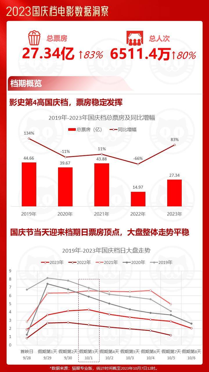 十一黄金周结束,2023年电影国庆档正式落下帷幕,电影市场最终以总票房累计27.34亿收尾,超去年同期83%,总观影人次超6511.4万,同比增长80%。