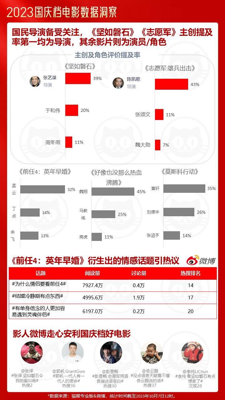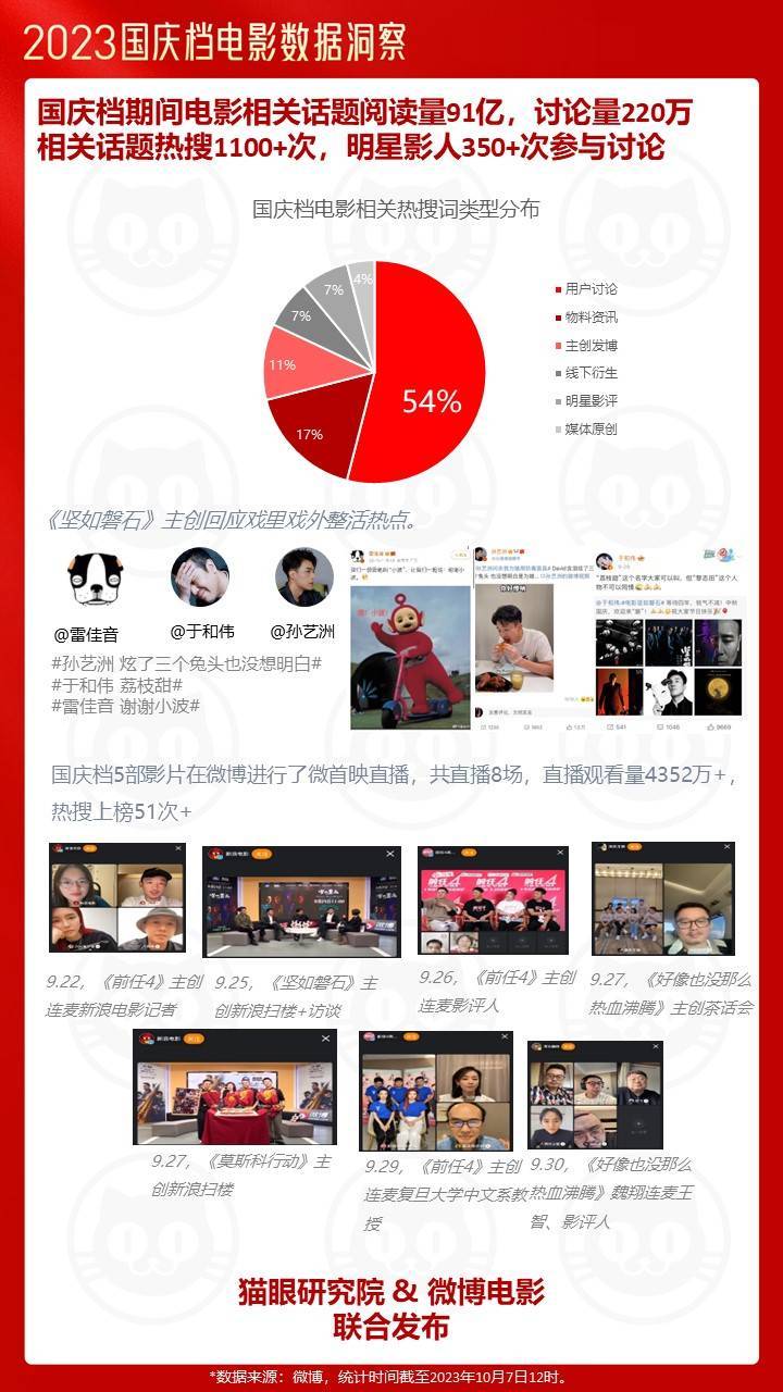如今,微博已成为电影口碑营销重镇。数据显示,2023年国庆档期间,电影相关话题阅读量高达91亿,讨论量超过220万,电影话题登上热搜1100余次,相关热搜词中,用户讨论占比高达54%,足见大众对档期内影片的关注。