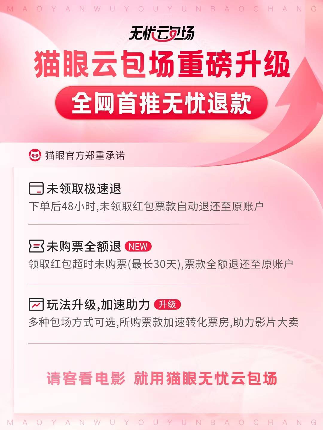 值得一提的是,此次国庆档,猫眼专业版“云包场”升级为“无忧云包场”。首先是“无忧退、全额退”功能的上线,当用户通过“云包场”助力影片后,未领取红包票款,将在下单后48小时内退回至原账户,被领取但超30天未购票使用的红包,也将全额退还至原账户,进一步降低“云包场”参与门槛,吸引更多行业好友和影迷为影片助力。