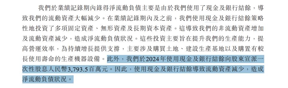 招股书中称,这笔钱是于2024年“使用现金及银行结余”向股东宣派,因此导致流动资产减少,造成净流动负债状况。