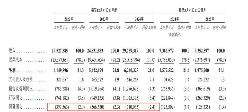 与此同时,从2022年到2024年,其贸易应付款项及应付票据分别为54.36亿、64.36亿、103.95亿,三年扩大91.2%,在2025年Q1,再上升至119.48亿。
