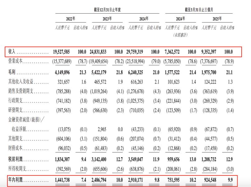 翻开招股书,2022年到2024年,奥克斯收入分别为195亿、248亿、298亿,三年增长了52.8%。净利润分别为14.4亿、24.9亿、29.1亿,三年增长102%。这其中,其海外市场高速发展,2022年到2024年分别贡献收入83.9亿、104.1亿、146.8亿,贡献了近半的收入,2025年Q1海外延续涨势,总营收中有57%来自海外。