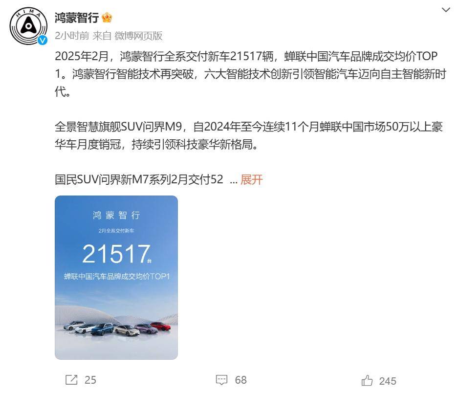 据鸿蒙智行微博,2025年2月,鸿蒙智行全系交付新车21517辆,蝉联中国汽车品牌成交均价TOP1。
