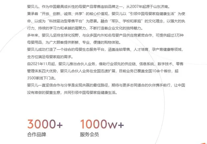 婴贝儿于2007年在济南创立,从2021年开始实施合伙人制度之后,其发展速度明显加快,实现了规模的指数增长。官网信息显示,婴贝儿业务已经覆盖全国十余个省份,线下门店数量超过3500家。