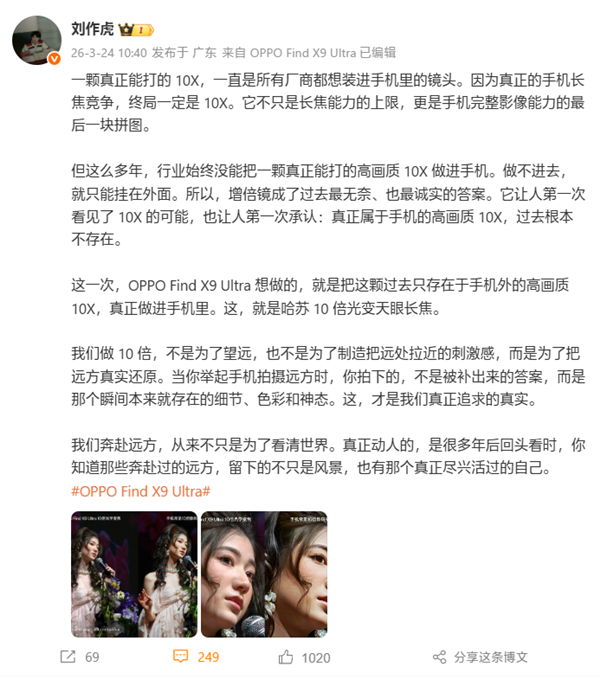 刘作虎晒OPPO Find X9 Ultra样张:搭载哈苏10倍光变天眼长焦 把远方真实还原快讯