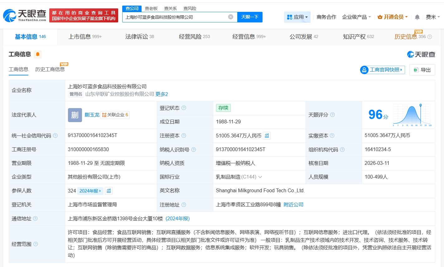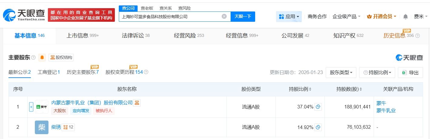 上海妙可蓝多食品科技股份有限公司成立于1988年11月,注册资本约5.1亿人民币,经营范围包括食品经营、食品互联网销售、互联网直播服务等。股东信息显示,该公司由内蒙古蒙牛乳业(集团)股份有限公司、柴琇等共同持股。