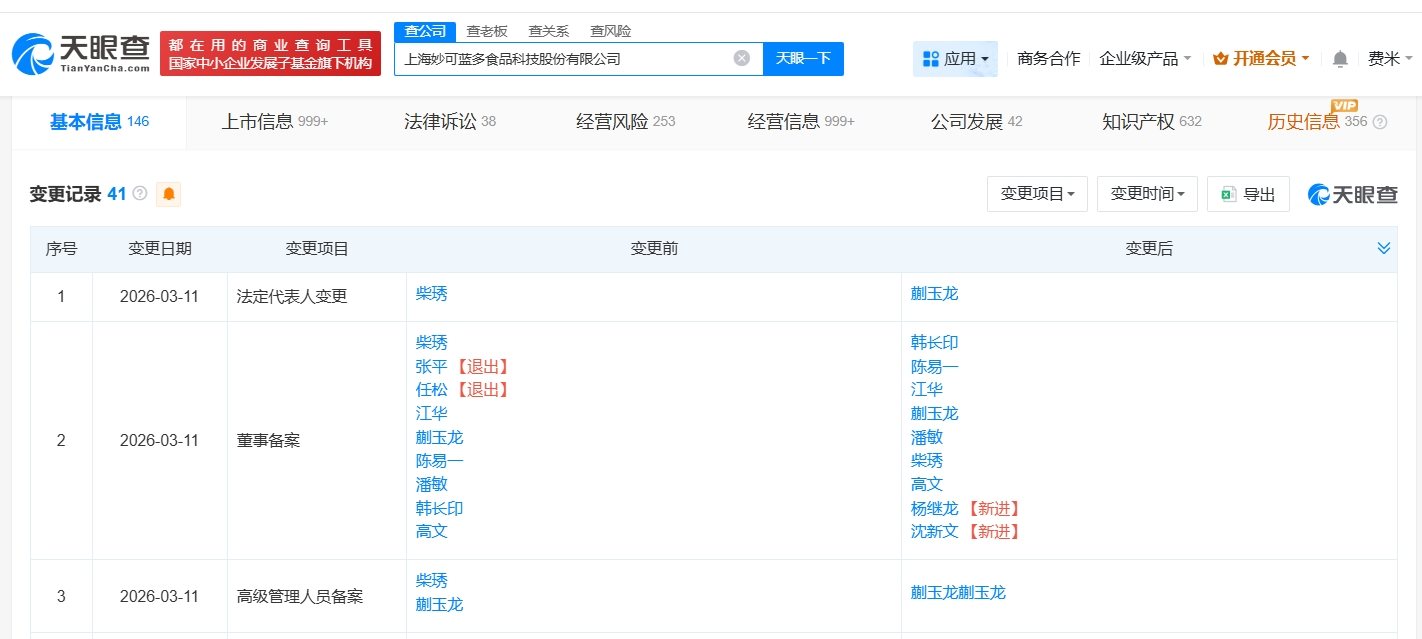 天眼查工商信息显示,近日,妙可蓝多(600882)发生工商变更,创始人柴琇卸任法定代表人,由蒯玉龙接任。