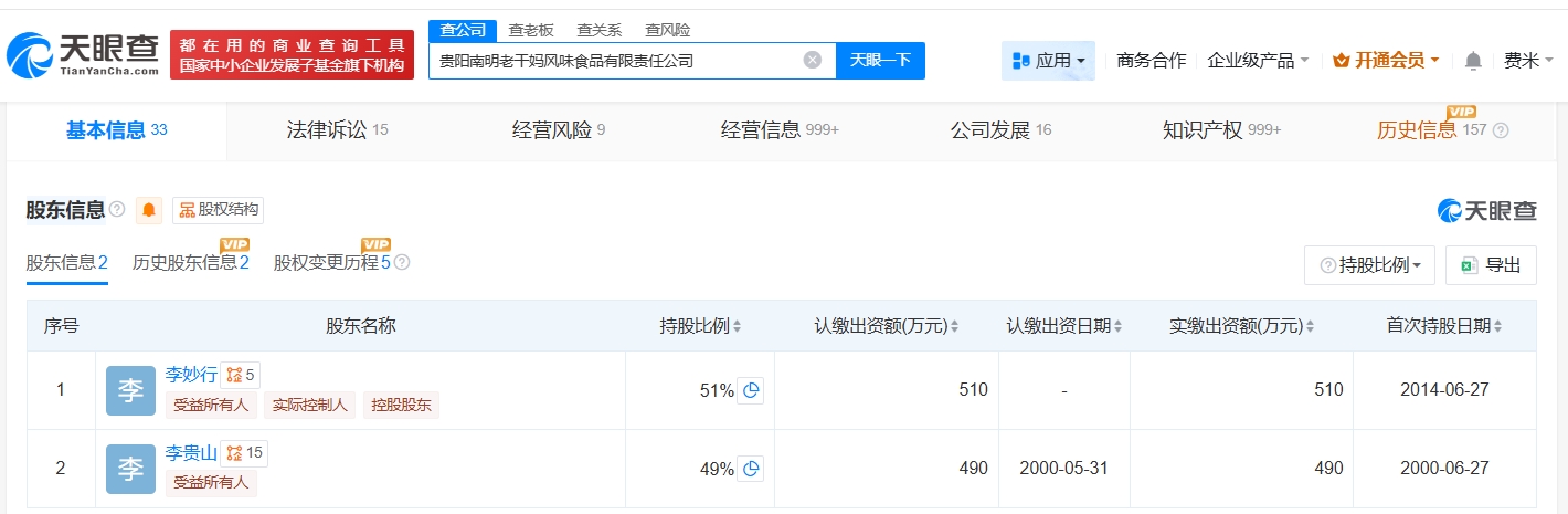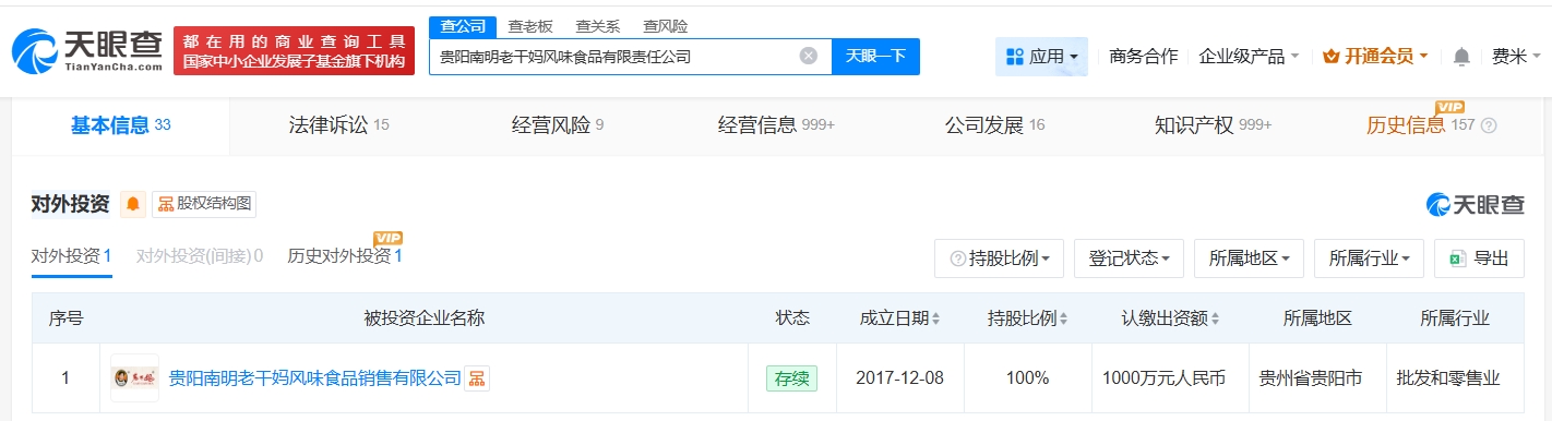 天眼查工商信息显示,老干妈关联公司贵阳南明老干妈风味食品有限责任公司成立于1997年10月,法定代表人为老干妈创始人陶华碧,注册资本1000万人民币,经营范围包括经营本企业自产的粮油食品的出口业务、蔬菜制品、辣椒制品的生产、销售及从事行业相关的设备、仪器、原材料的进口业务等。股东信息显示,该公司由陶华碧之子李妙行、李贵山共同持股。对外投资信息显示,该公司对外投资贵阳南明老干妈风味食品销售有限公司。